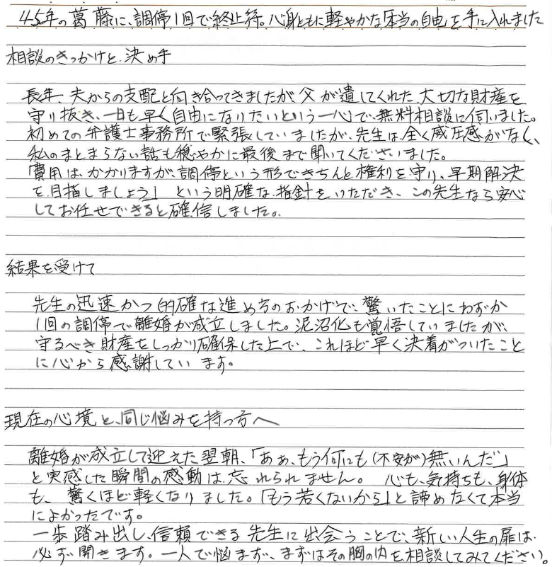 先生の迅速かつ的確な進め方のおかげで、驚いたことにわずか1回の調停で離婚が成立しました。泥沼化も覚悟していましたが守るべき財産をしっかり確保した上で、これほど早く決着がついたことに心から感謝しています。