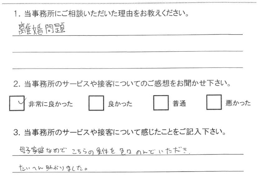 インターネットで離婚の相談を探したところ、西村法律事務所が出ていたのでお願いしま