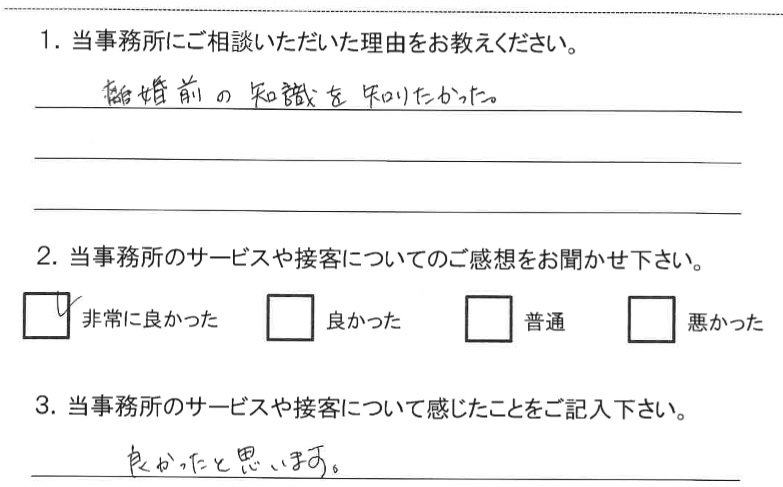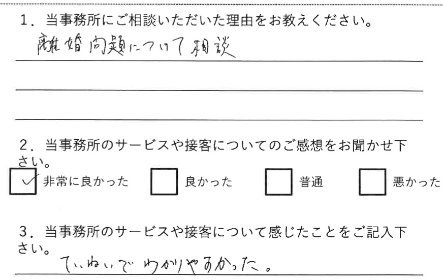 とても親切に分かりやすくお話くださり来て良かったと思いました。受付でのTEL対応、弁護士さんの人柄もとても良かったです。