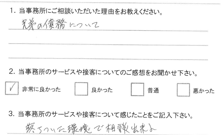 弁護士の先生もとても親身で、丁寧に教えて下さいました。相談に来て本当に良かったと